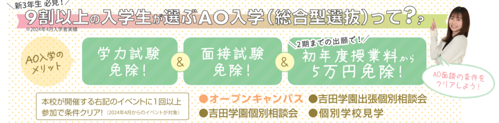 🌟AOエントリー対象イベントに未参加の方は、お早めにオープンキャンパス/個別学校見学/吉田学園出張個別相談会/個別相談会にご参加ください。