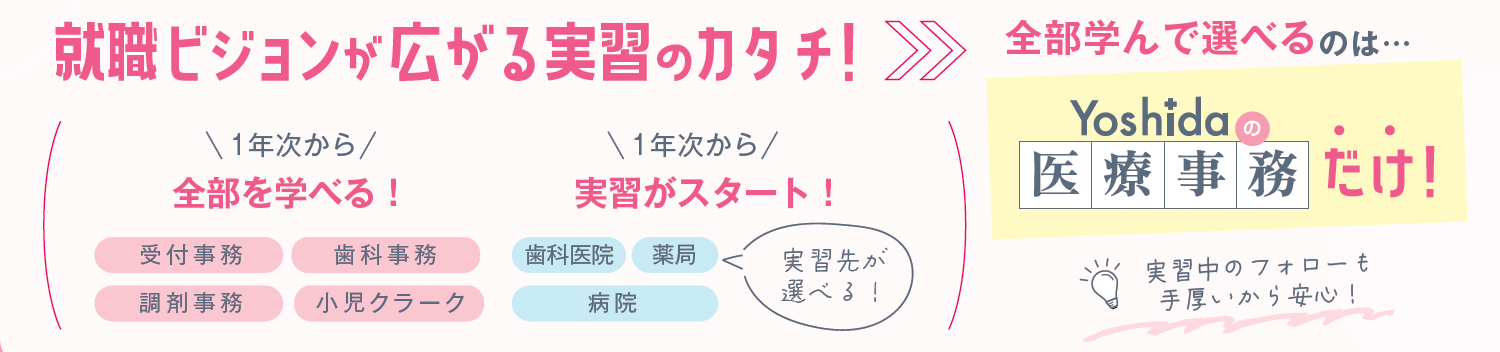 コース制を設けていないYoshida医療事務だからできる手厚く丁寧なサポートで学生のみんなも安心して実習に行くことができます。