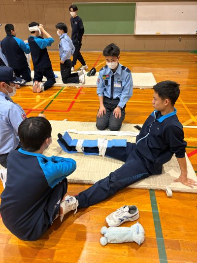 小グループに分かれて「心肺蘇生」「搬送法」「止血・固定」などをレクチャーし、